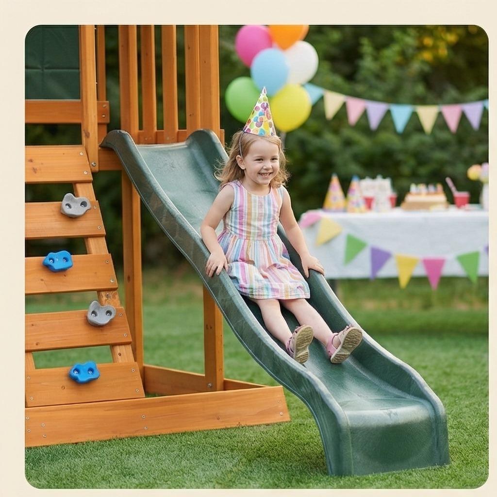 Provide hours of entertainment with 2 belt swings, an upper fort, and a chalk board.
